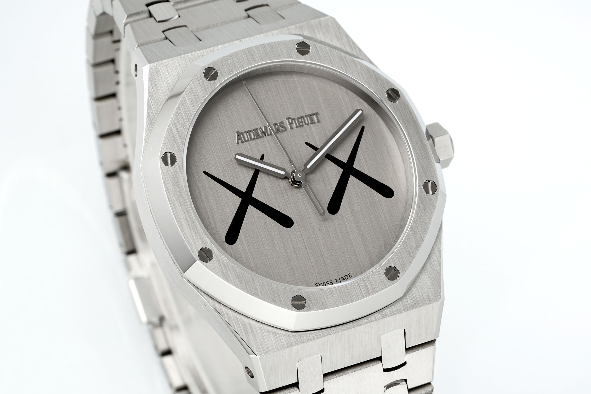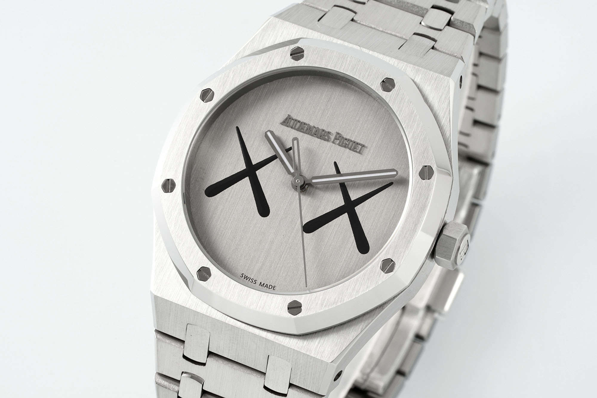 The Audemars Piguet x Kaws limited edition watch features a stainless steel case with the signature “X” motif by Kaws on the dial, merging street art with luxury craftsmanship.