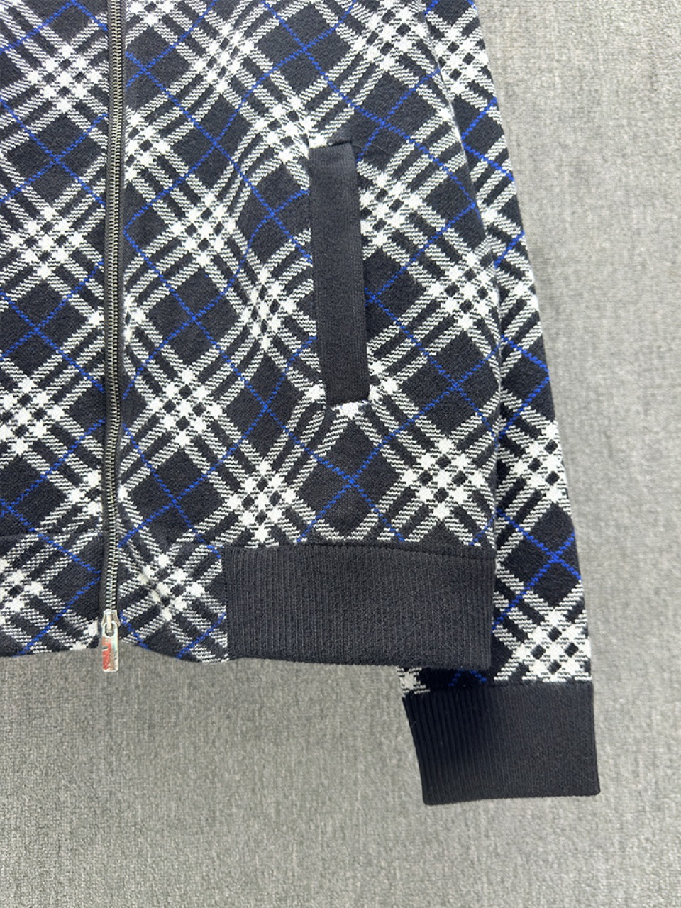 Crafted from a lightweight wool-blend fabric, it combines warmth and softness with breathability. The intricate jacquard check pattern delivers a refined texture, while the double zip closure and rib-knit trims at the collar, cuffs, and hem ensure a clean, structured shape.