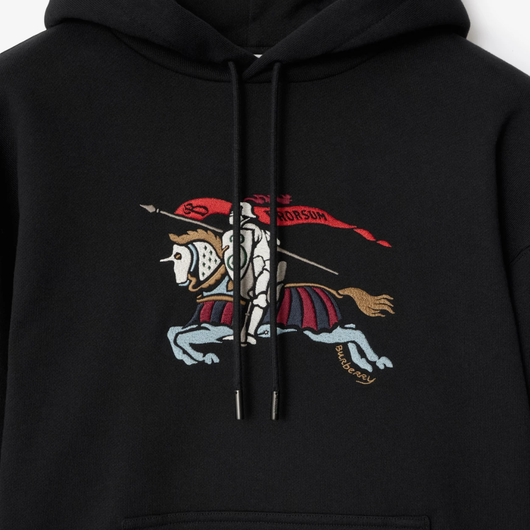 Crafted from premium loopback cotton, this hoodie features Burberry’s signature Equestrian Knight Design (EKD) embroidered in rich multicolored threads. The dynamic motif captures the energy of motion, combining streetwear ease with heritage artistry.