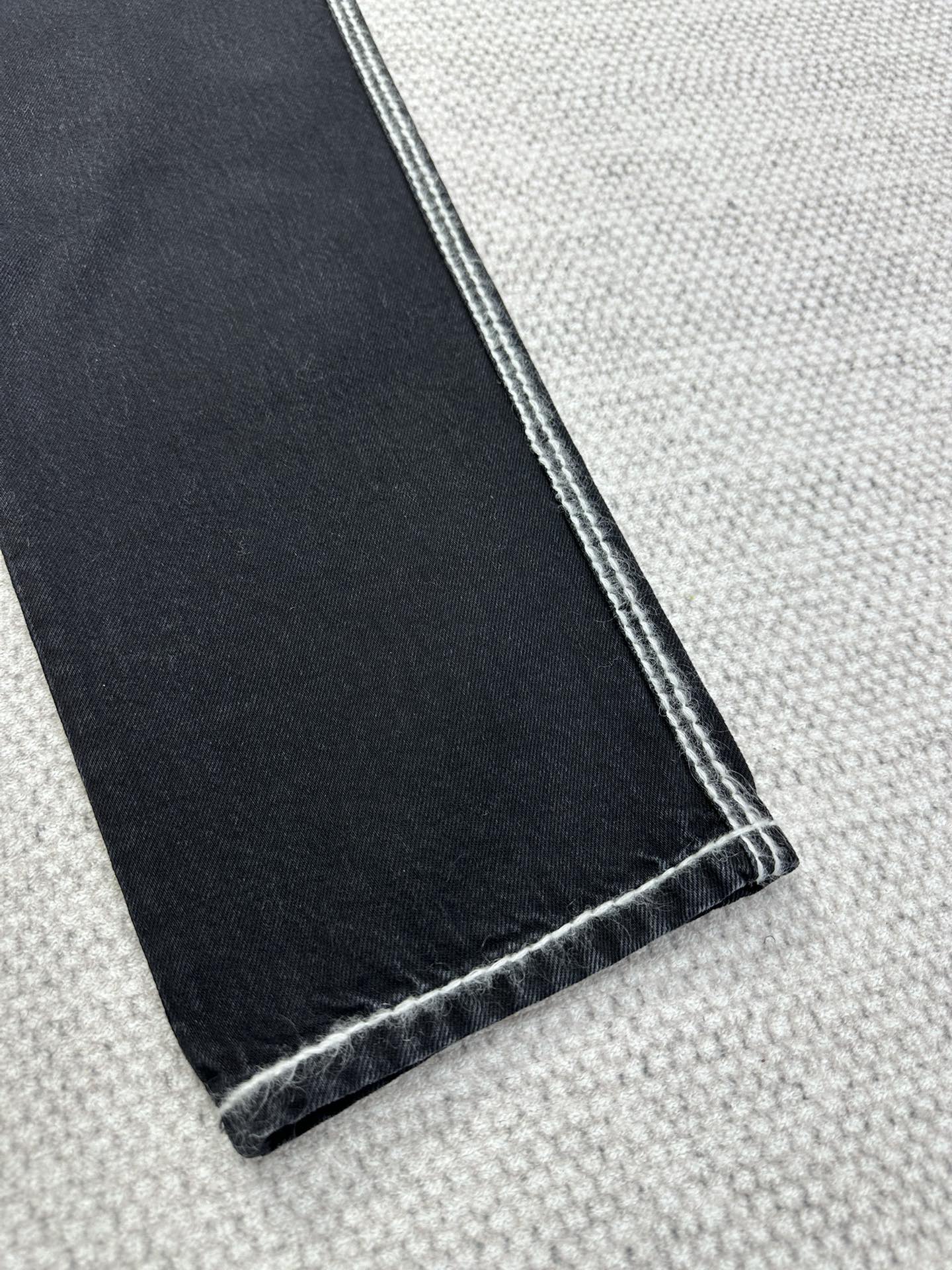 The signature white contour stitching traces the seams and pockets, creating a comic-like illusion of depth and contrast, while the high-waisted straight-leg cut visually elongates the legs.
