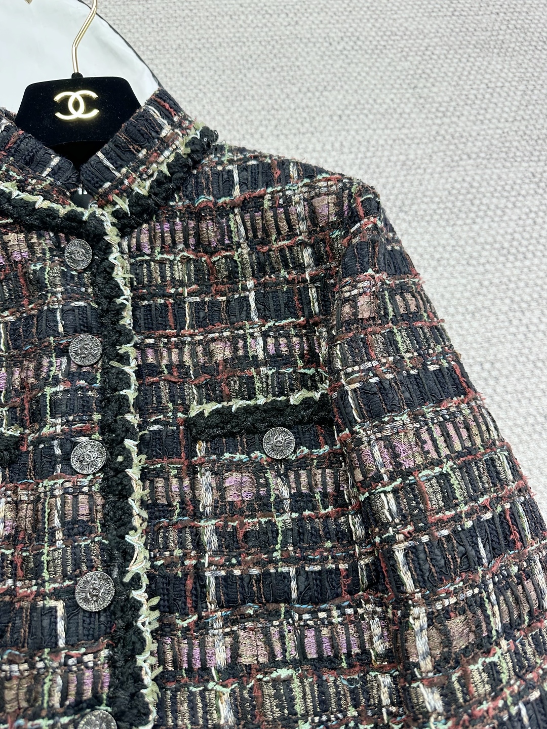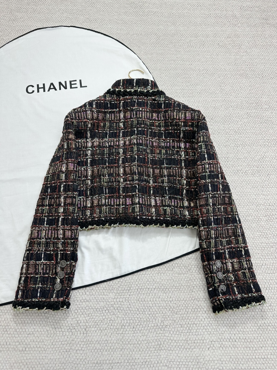 A cropped silhouette enhances the natural waistline, while the four-pocket structure pays homage to CHANEL’s legendary jacket design. Contrasting trims and delicate chain embellishments define the edges with quiet sophistication, and each button bears the iconic interlocking CC emblem — a discreet signature of craftsmanship.