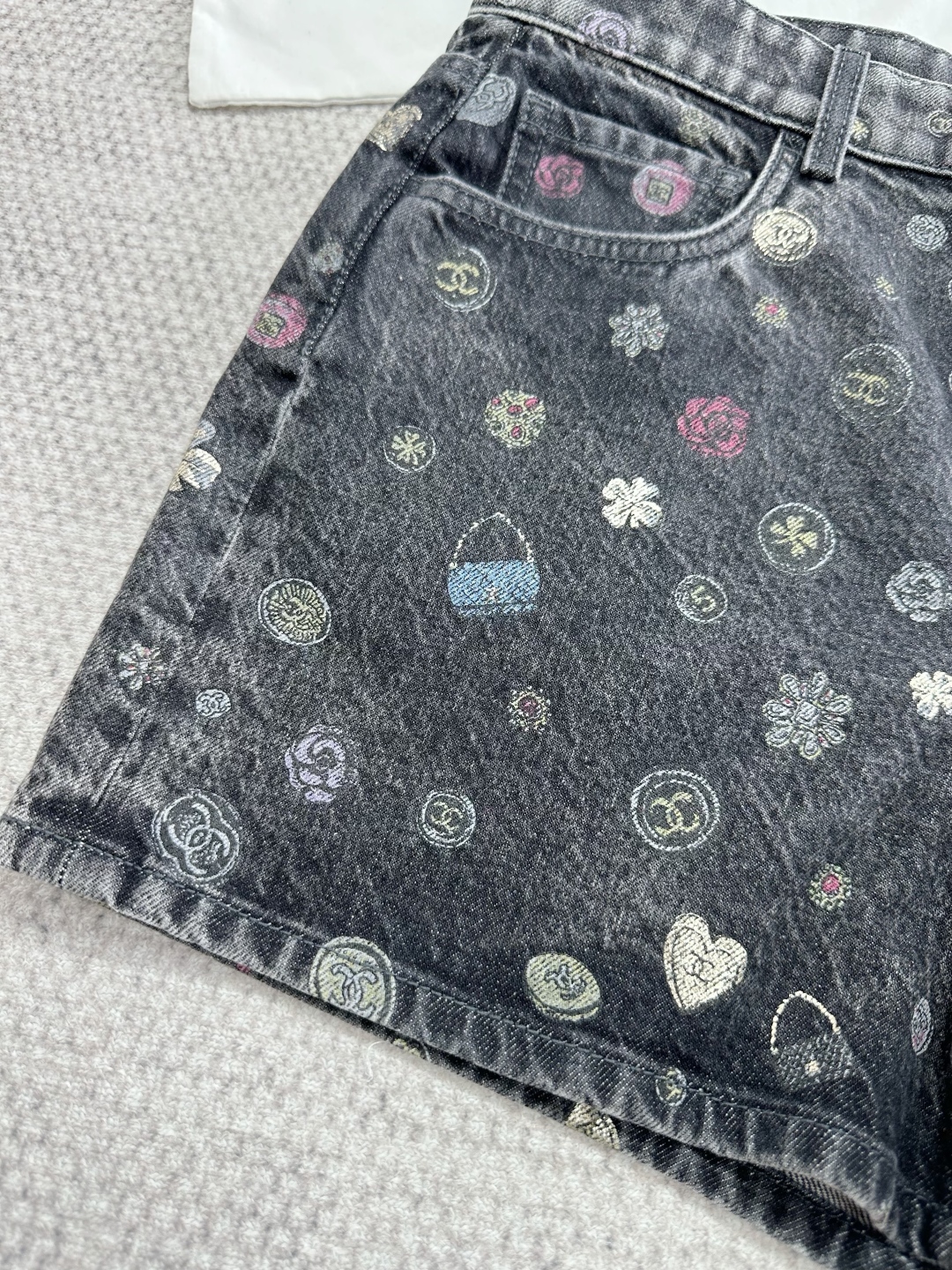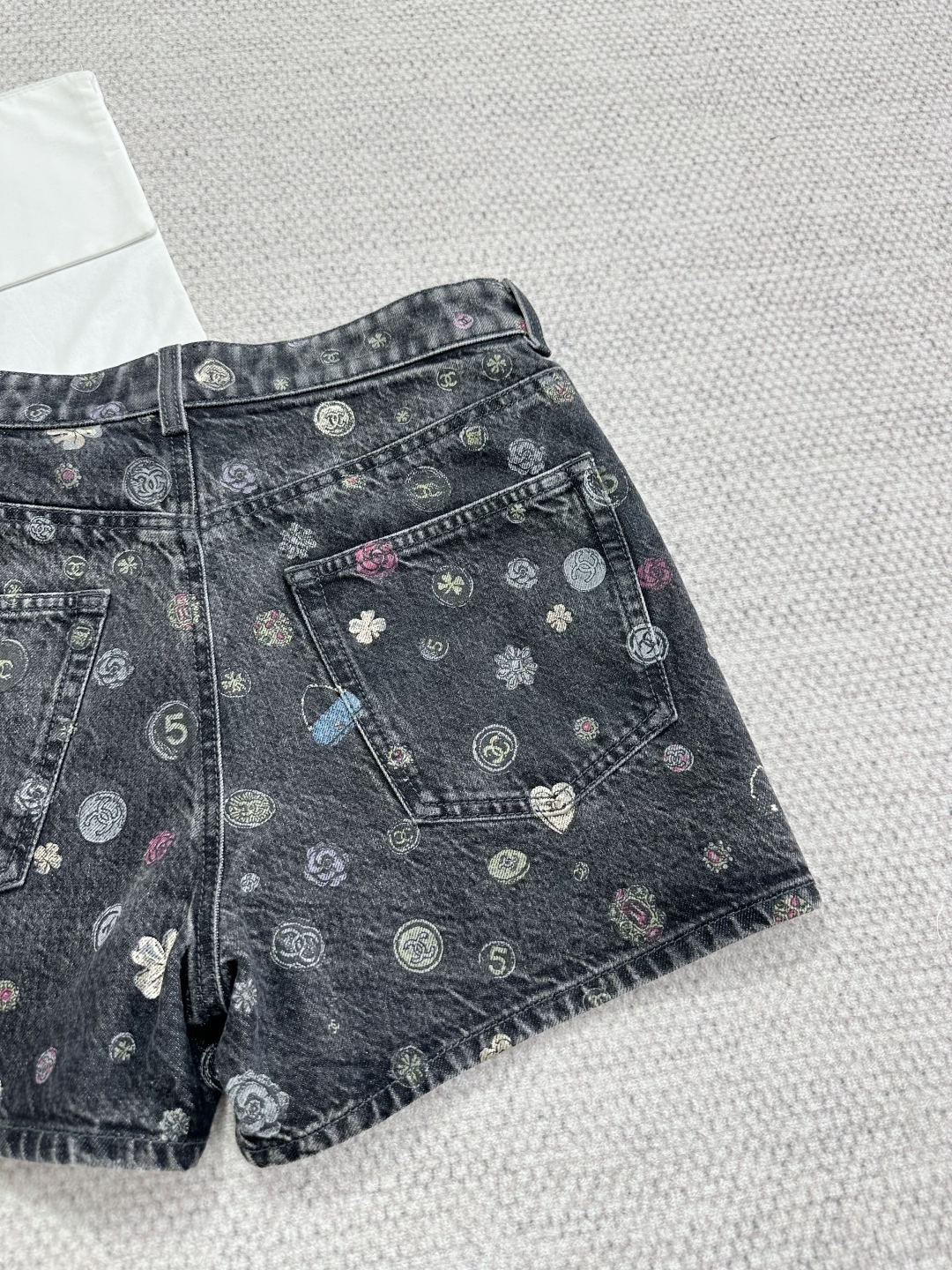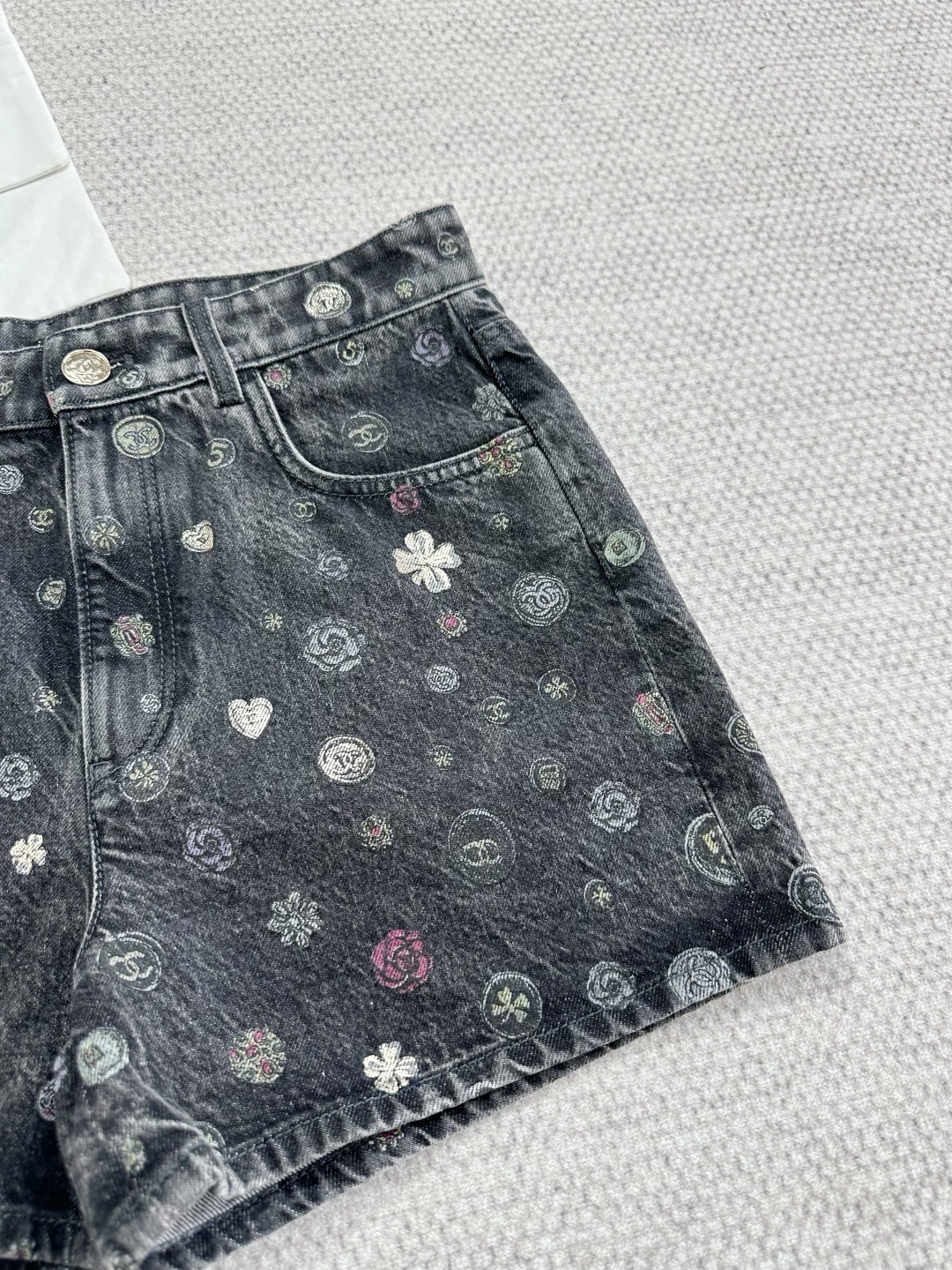 CHANEL CC25B Coin & Floral Print Denim Shorts