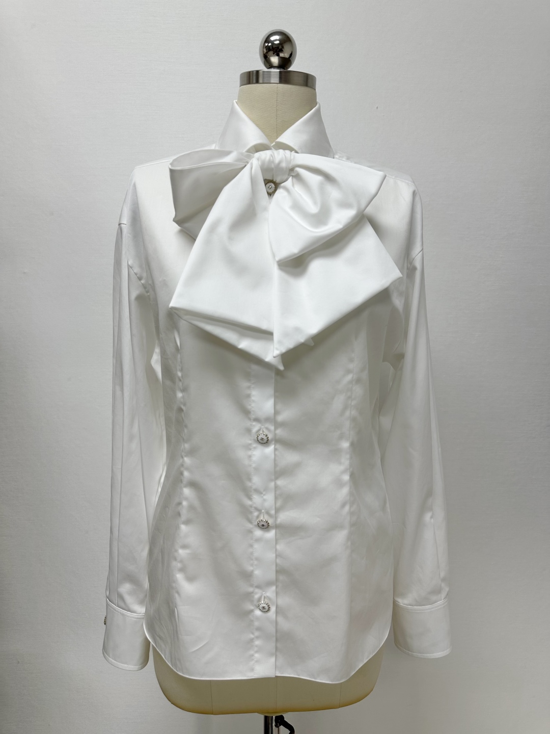 A study in modern femininity — crisp cotton, graceful lines, and a bow that whispers confidence.