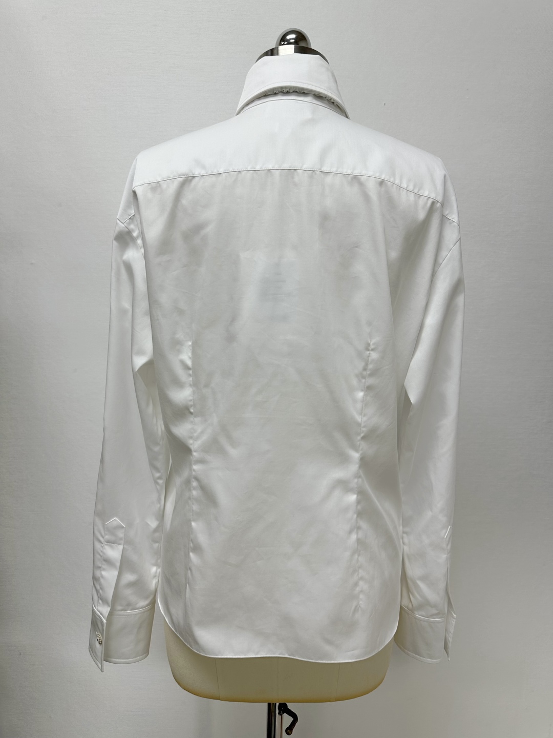 The CHANEL CC25K Cotton Poplin Blouse with Bow Tie embodies the maison’s timeless harmony of simplicity and refinement. Tailored from fine 100-thread-count cotton poplin, the fabric is smooth, breathable, and impeccably structured, balancing lightness with polished precision.