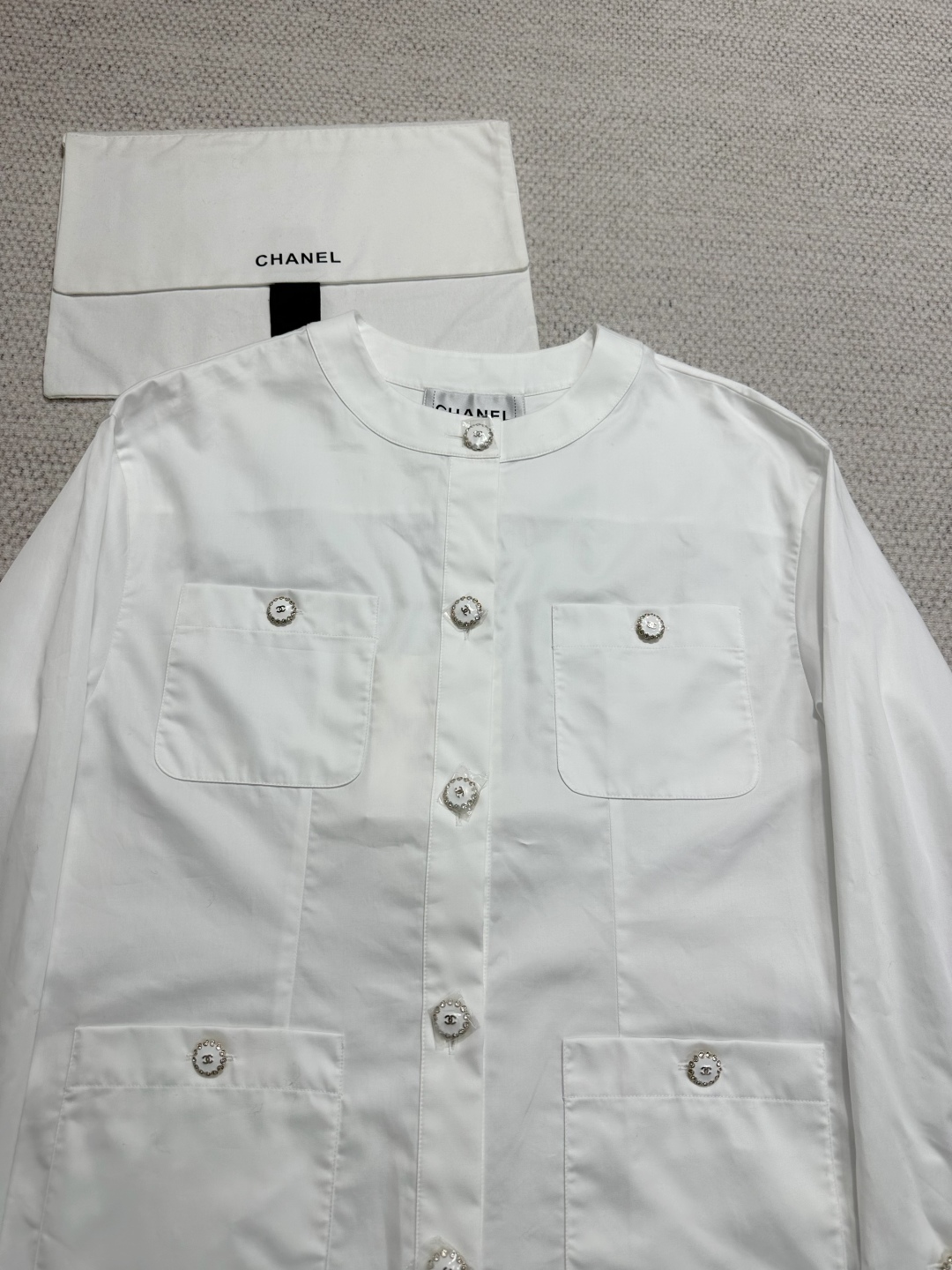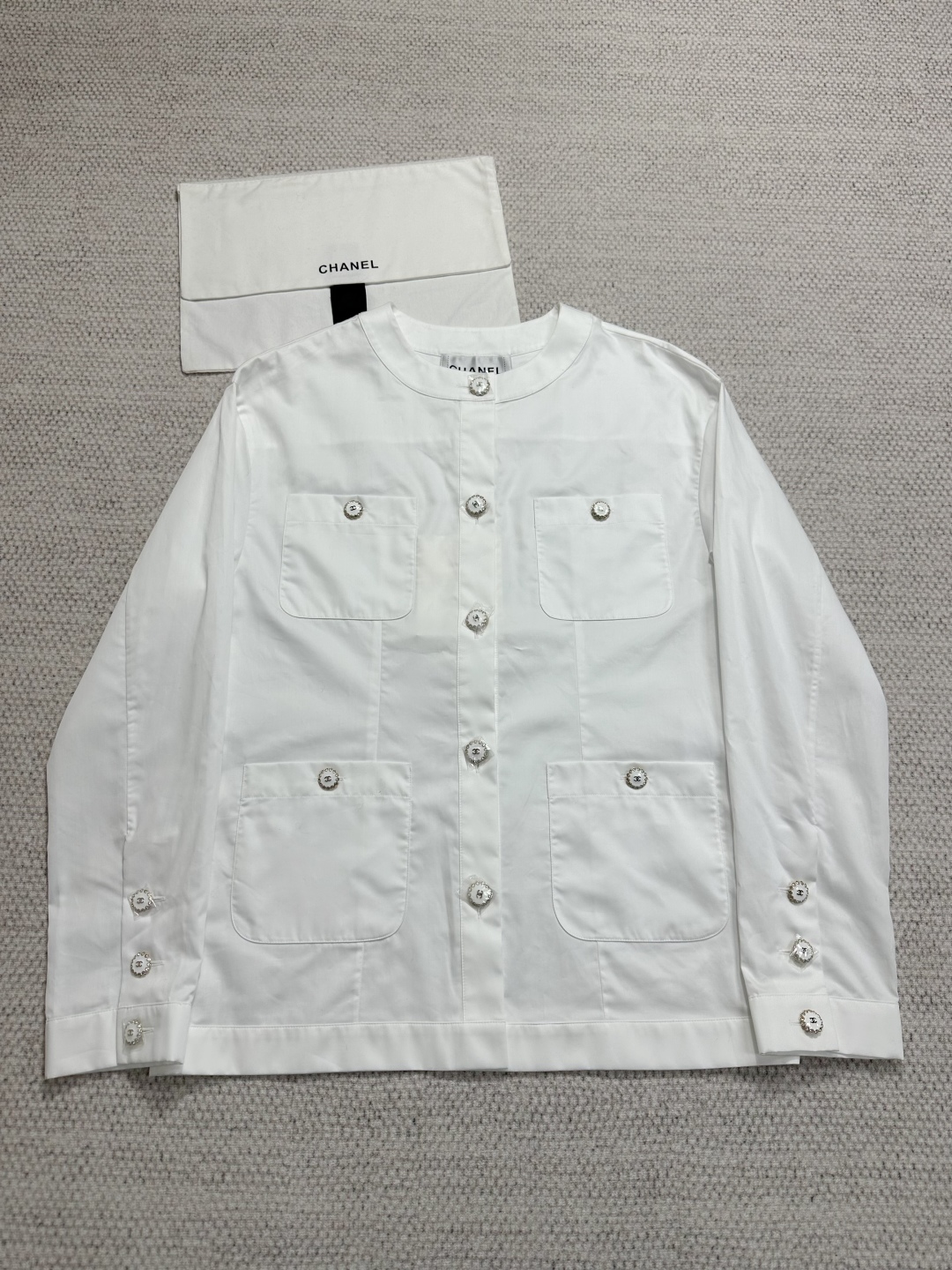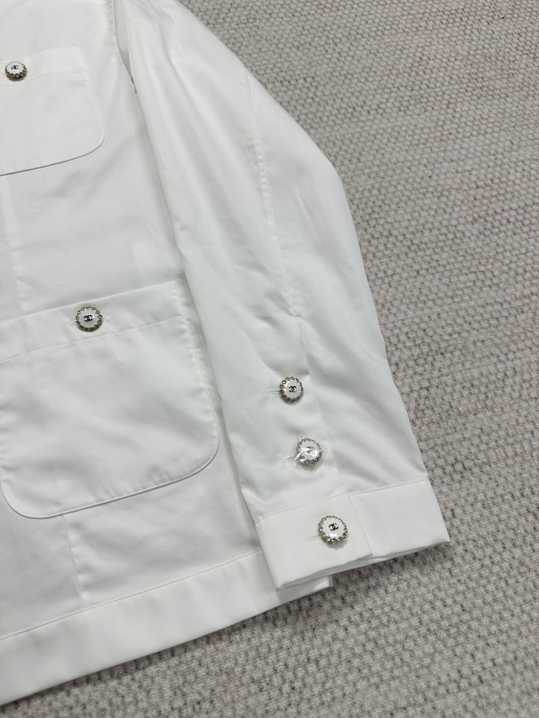 The four-pocket design pays homage to CHANEL’s heritage silhouettes, combining symmetry with a sense of effortless order. Pearl-finish buttons gleam softly against the pristine white canvas, reflecting the understated luxury that defines the house’s aesthetic.