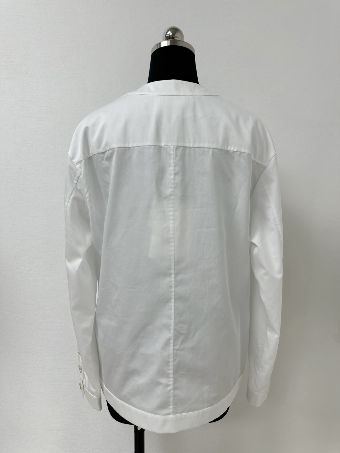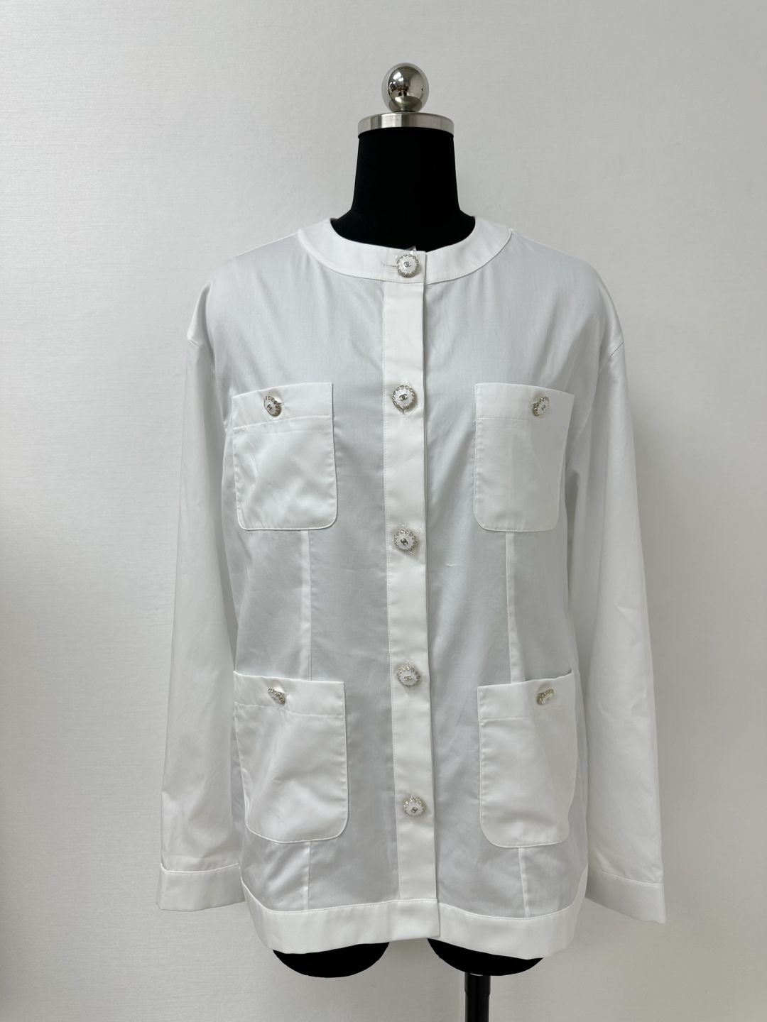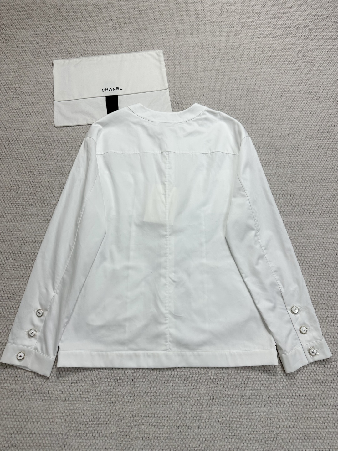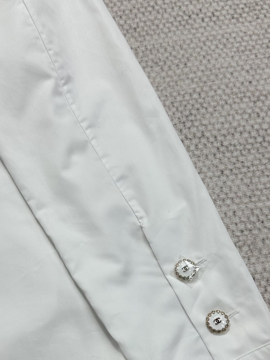 The four-pocket design pays homage to CHANEL’s heritage silhouettes, combining symmetry with a sense of effortless order. Pearl-finish buttons gleam softly against the pristine white canvas, reflecting the understated luxury that defines the house’s aesthetic.