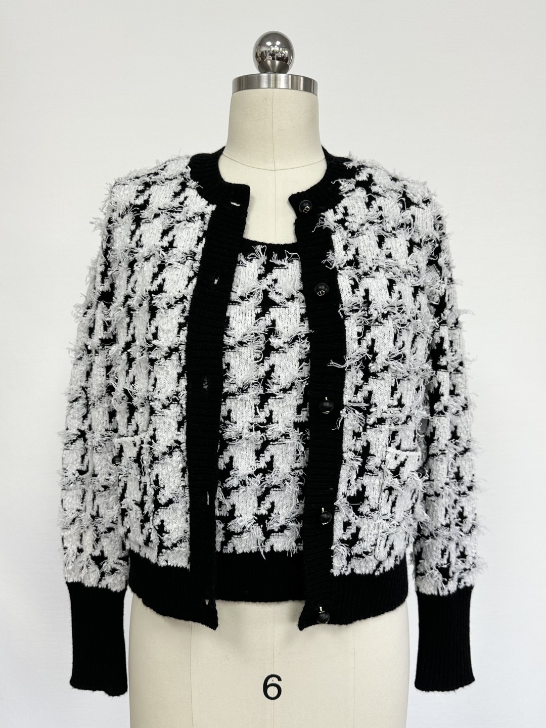 Crafted from a premium wool-blend yarn in classic black and white tones, the set includes a round-neck cardigan and matching knit camisole, both featuring a refined structure with a soft yet sculpted silhouette.