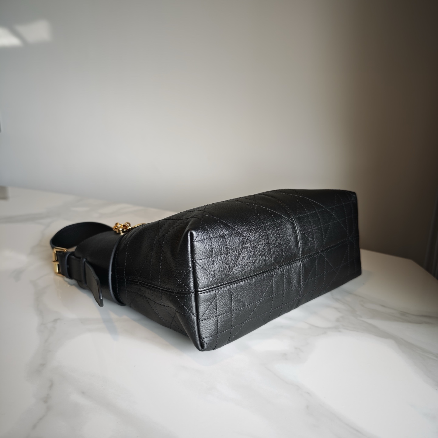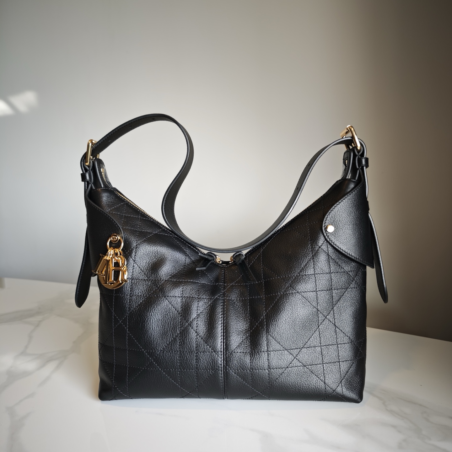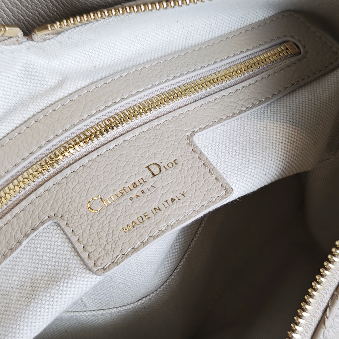 The signature Cannage topstitching adds depth and a subtle sheen to the bag’s minimalist shape. A double zip closure ensures practicality, while the metal D.I.O.R. charm lends a refined, feminine touch.