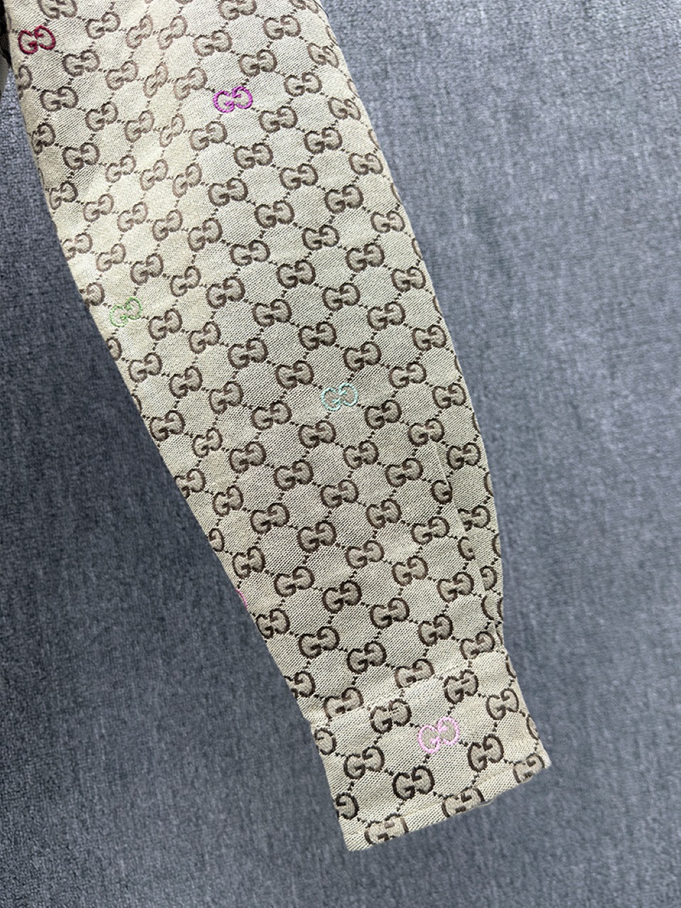 From Gucci’s Fall/Winter 2025 collection, this overshirt jacket is crafted from premium GG jacquard cotton, featuring the house’s iconic monogram pattern interwoven with colorful letter motifs. The result is a refined texture that merges vintage heritage with a contemporary silhouette.
