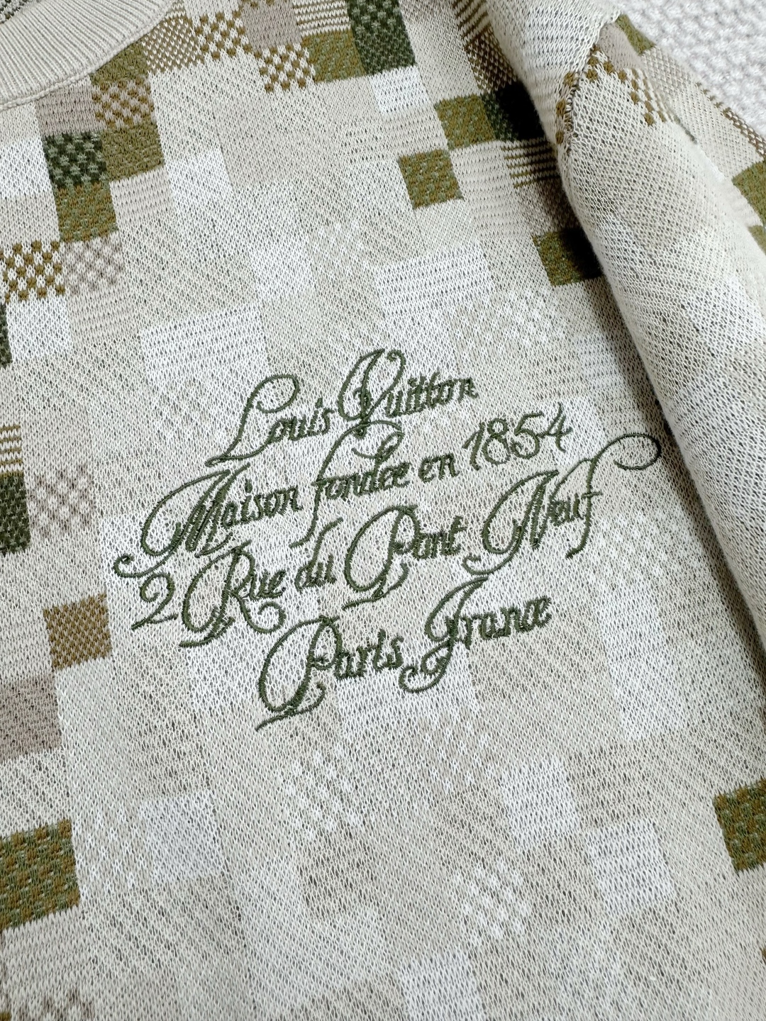 Knitted from 100% fine cotton yarn, it features a fully dyed construction with meticulously aligned pattern blocks and a smooth, soft hand feel. The chest is embroidered with the “Louis Vuitton Déposée” signature, lending understated refinement to the piece.