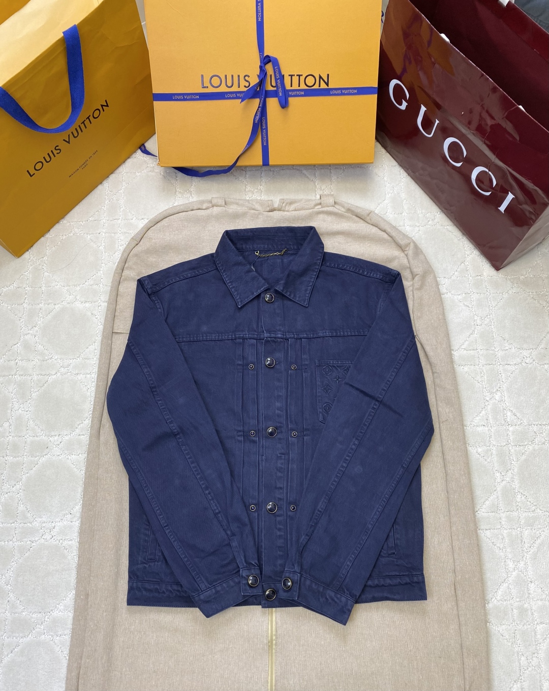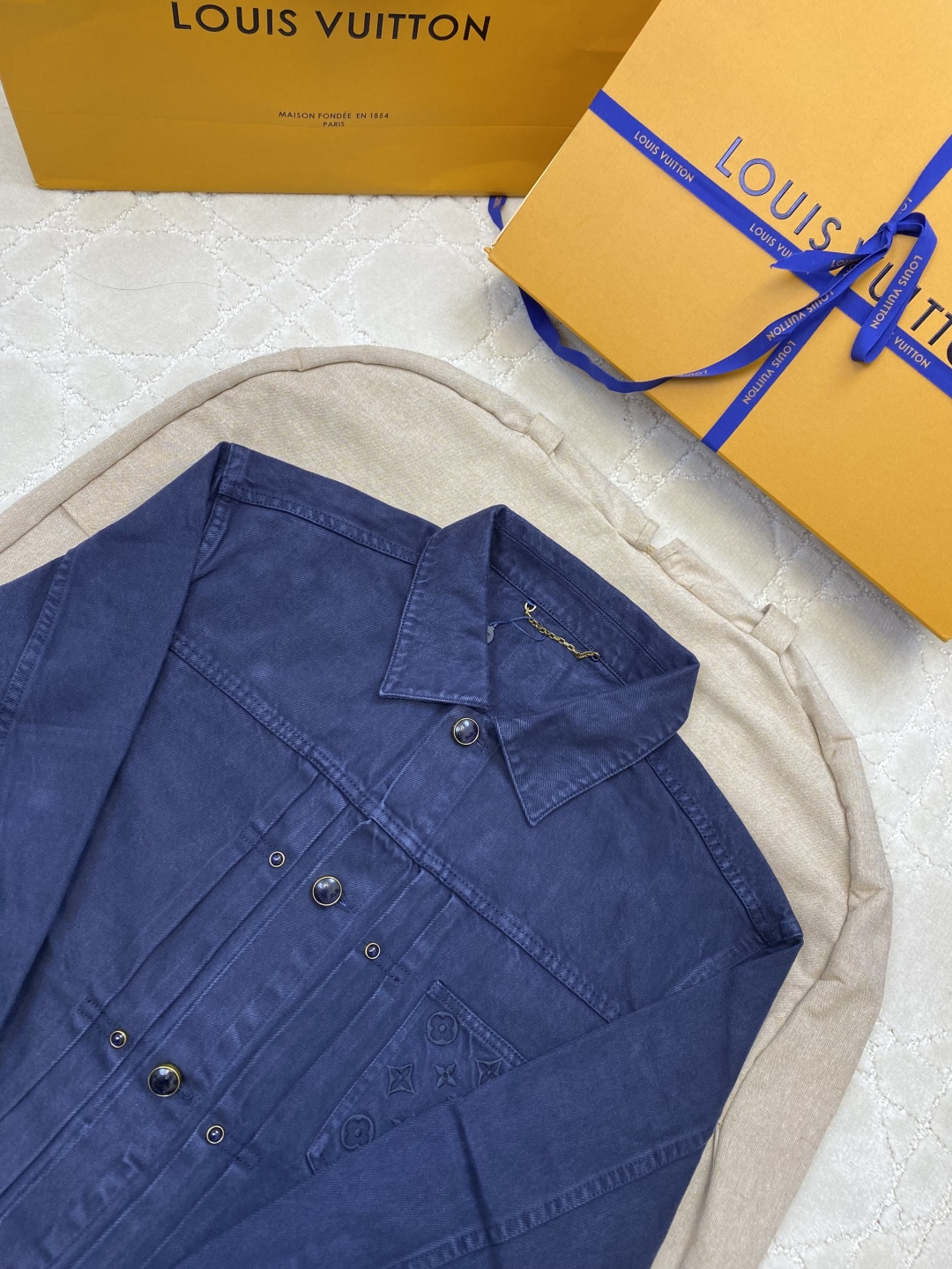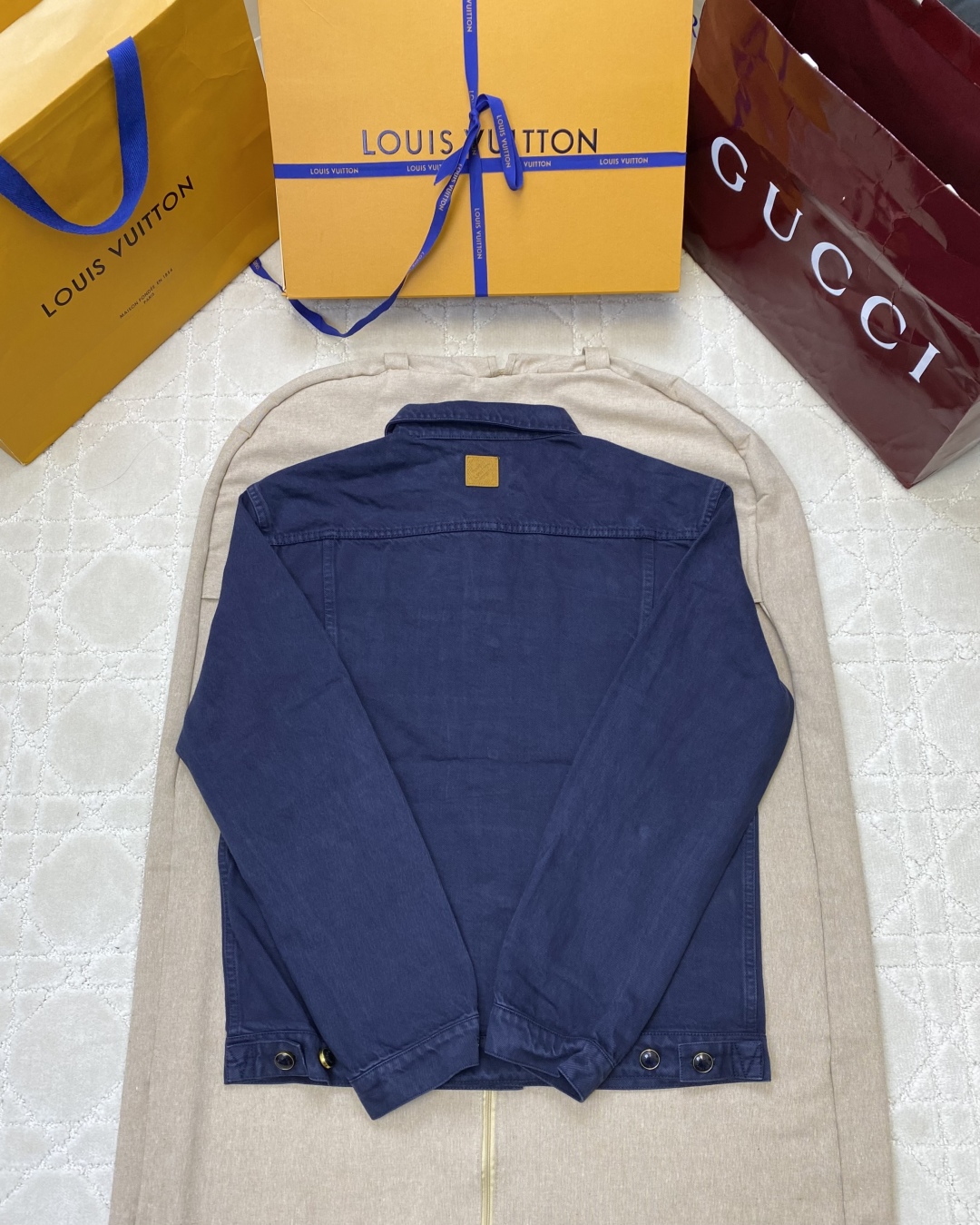 Crafted from premium washed denim, this Louis Vuitton 2025SS outerwear redefines modern luxury with a timeless silhouette. The fabric features a hand-finished vintage wash that enhances the rich indigo tone and natural texture. The signature LV embroidery on the chest adds a subtle yet unmistakable brand accent, making it a sophisticated staple for both casual and elevated looks.