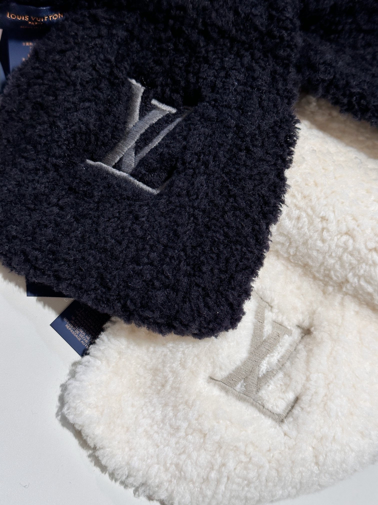 An embroidered LV monogram adorns one end, lending a subtle yet sophisticated accent. Available in black and white, the scarf features a loop-through design that allows for effortless styling — forming a neat bow or a sleek drape to complement any winter ensemble.