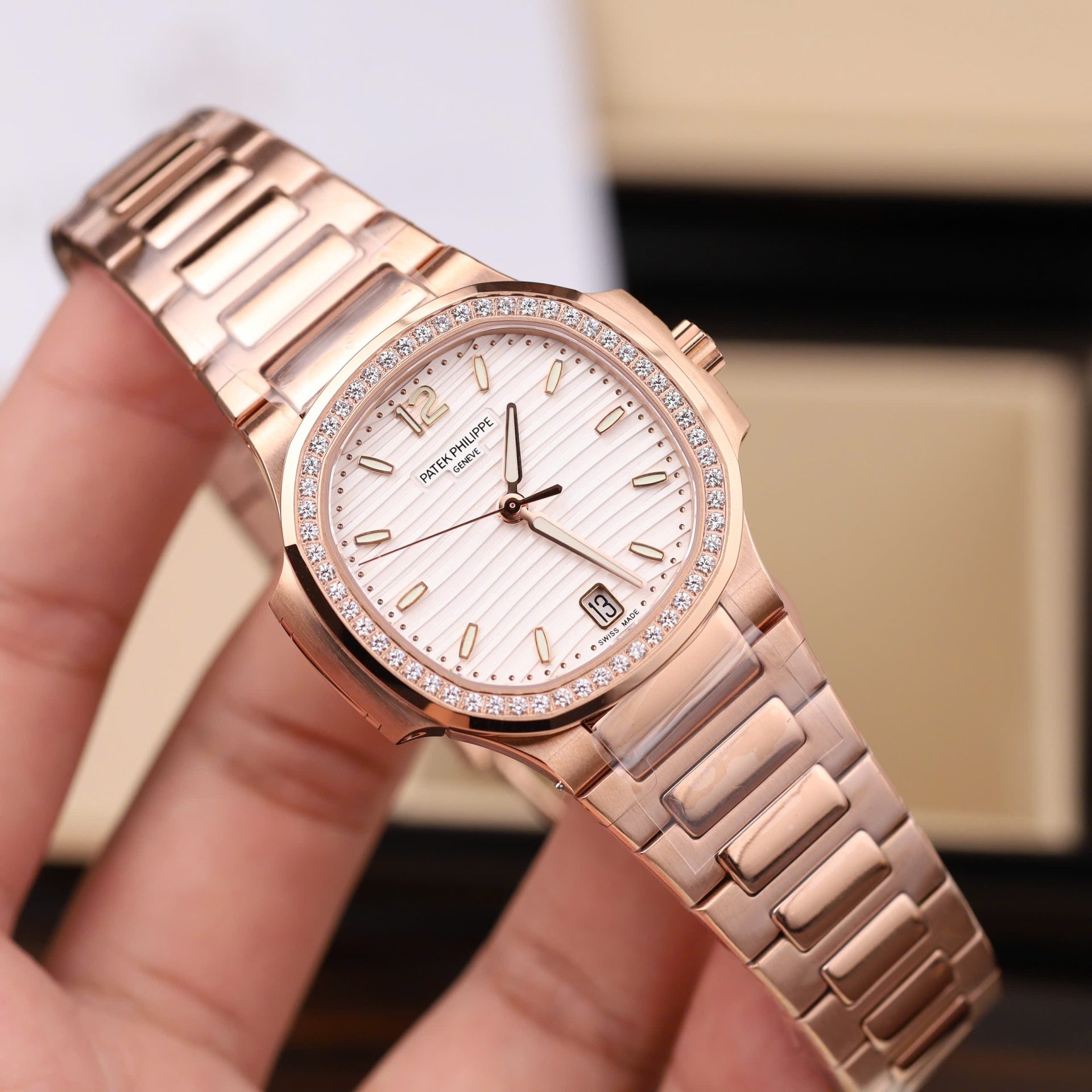 Patek Philippe Nautilus 7118 Fake Watch White Dial Bezel Stone CZ GR Factory 35.2mm