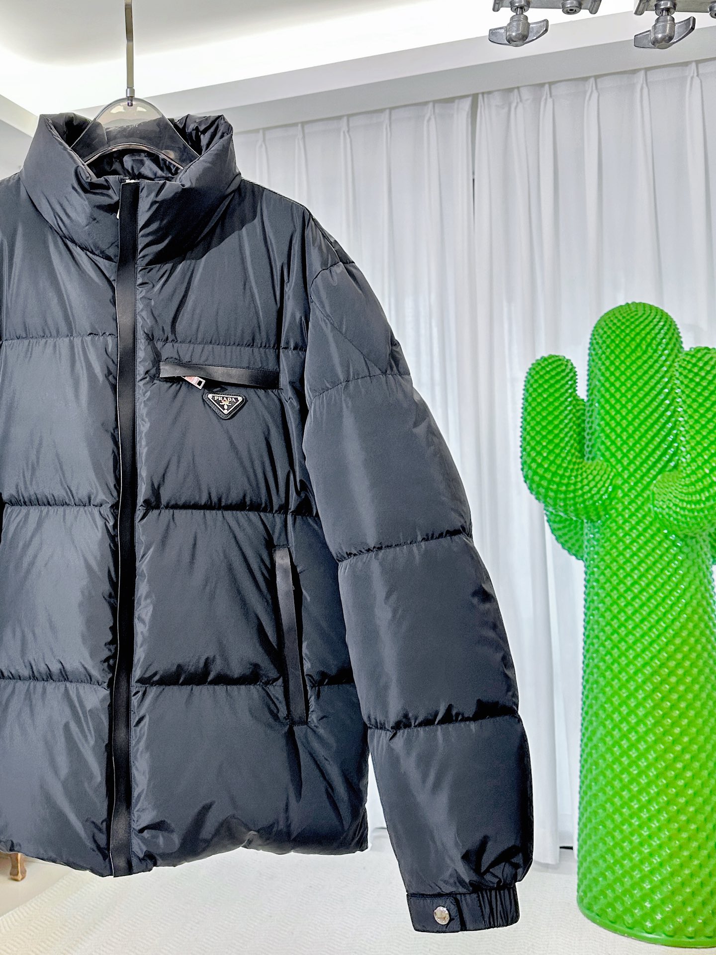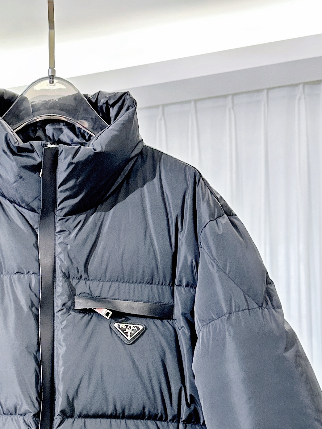 Cut in an oversized silhouette, the piece features smooth leather trims and the iconic enameled metal triangle logo on the chest pocket — hallmarks of Prada’s modern craftsmanship. The sleek stand collar and polished hardware complete a versatile look that balances functionality and sophistication, perfect for both city life and winter getaways.